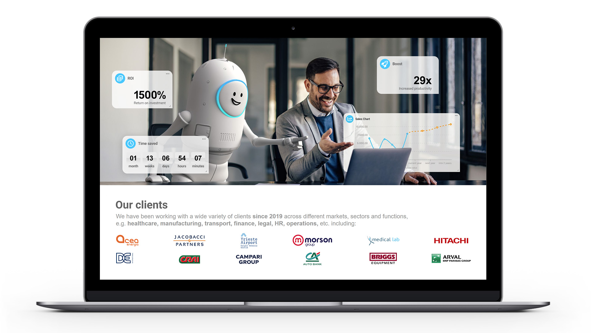 Creazione del marchio, grafica per stampa, digital, web e UI interfaccia grafica del software. Creazione di mascotte 3D, rappresentata da un amichevole robot, il quale illustra e guida l’utente nell’utilizzo dell’applicazione e dei suoi strumenti.