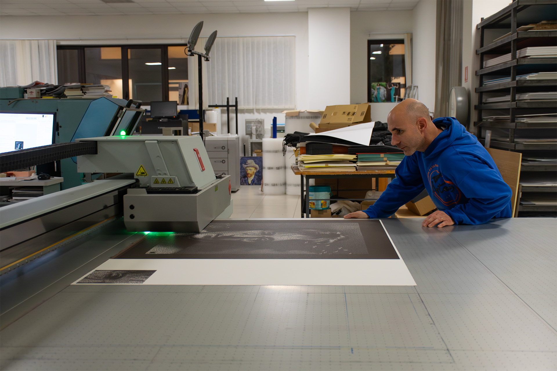 Alongside her, a dancer interprets the music through the body, moving in rhythm with sound waves. Through the use of light, optical fibers, and long exposure, movement generates luminous trails that echo and amplify the graphic lines of the artwork. The body thus becomes the medium through which sound manifests in space, making visible what is normally invisible.