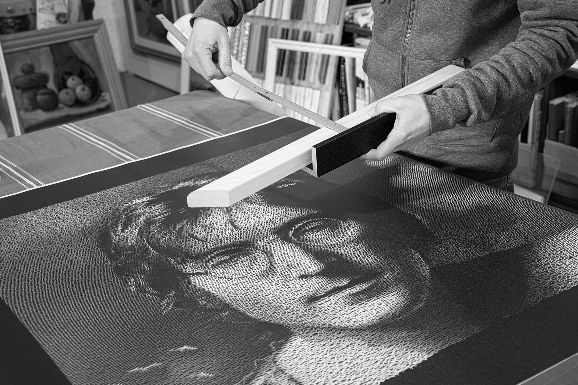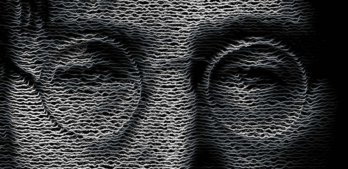 The drawing is created through graphic arts that utilize lines, called soundwaves, modeled from musical audio input.