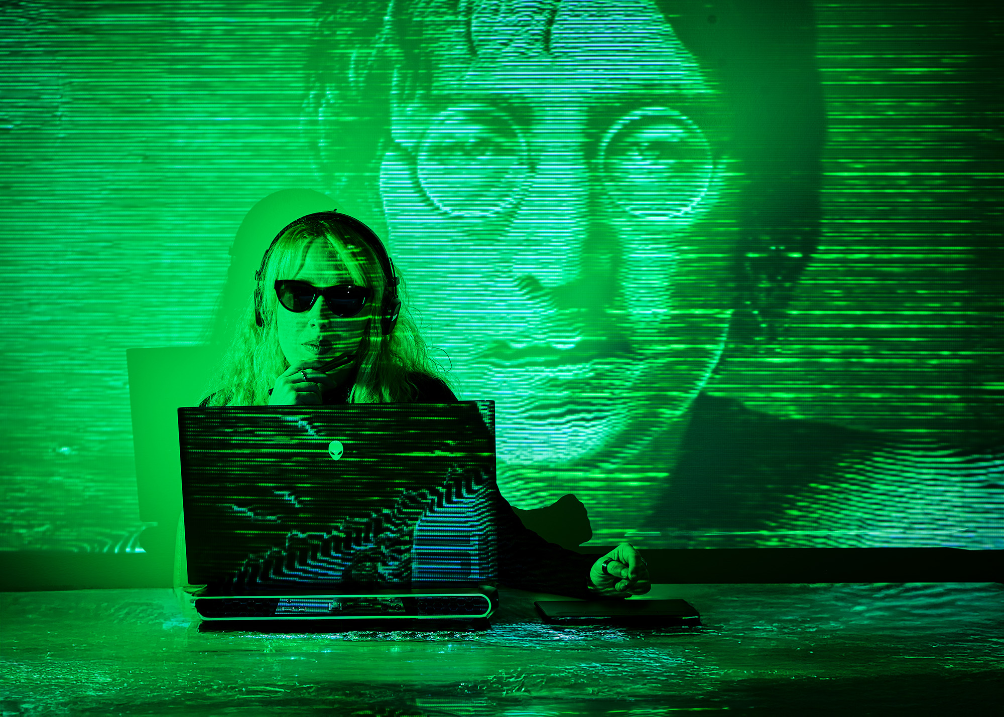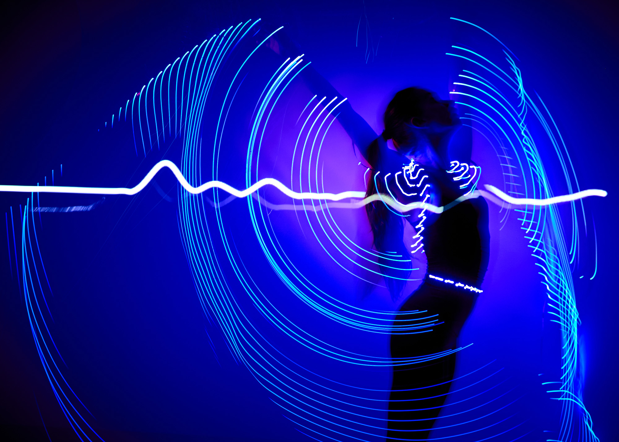 Oltre a lei, una ballerina interpreta la musica con il corpo, danzando al ritmo delle onde sonore. Attraverso l’uso di luci, fibre ottiche e lunga esposizione, il movimento genera scie luminose che riprendono e amplificano le linee grafiche dell’opera. Il corpo diventa così il mezzo attraverso cui il suono si manifesta nello spazio, rendendo visibile ciò che normalmente è invisibile.